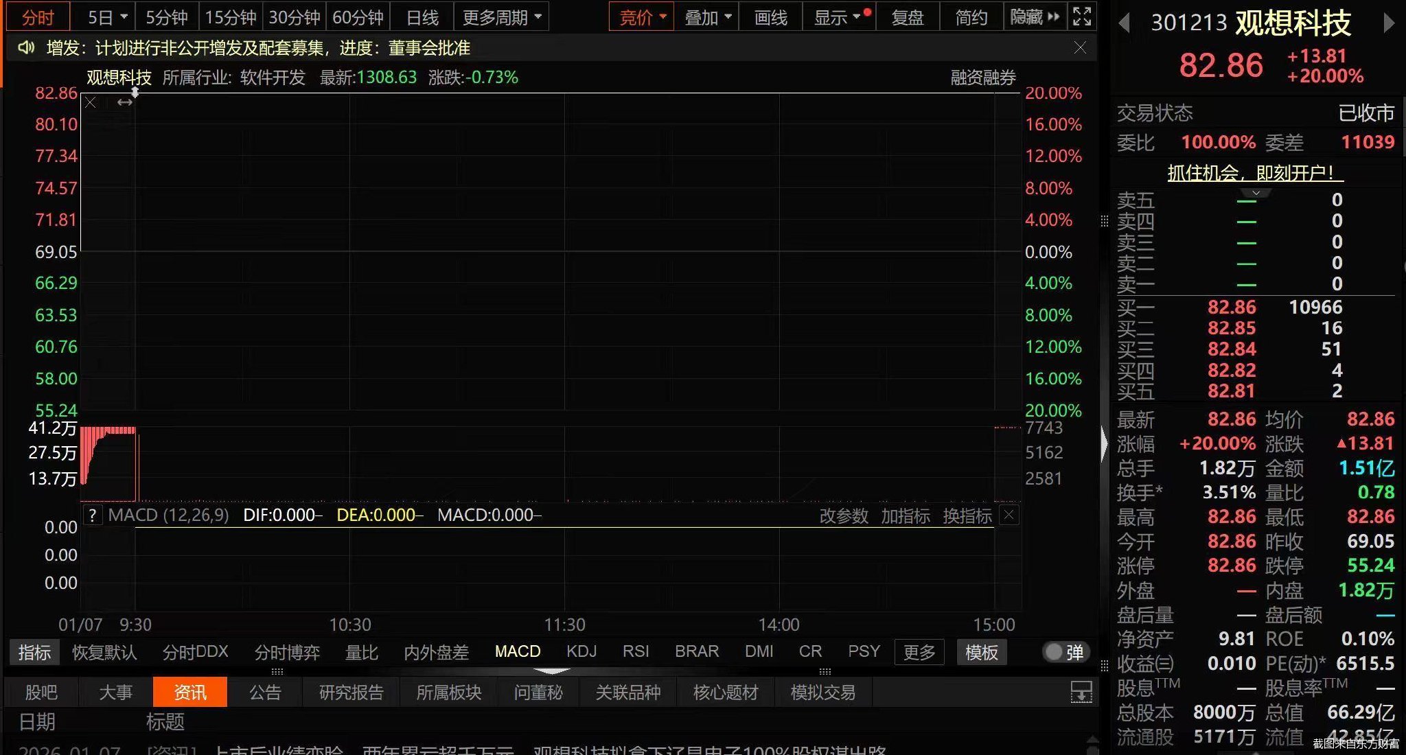 交易行情显示,1月7日,观想科技“一”字涨停,截至收盘,公司股价收于涨停价82.86元/股,成交金额1.51亿元,最新总市值66.29亿元。